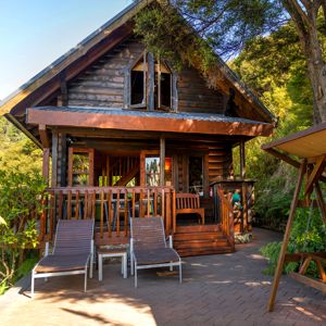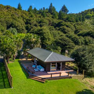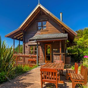 Our 2 bedroom chalets are hand crafted from NZ Redwood and Macrocarpa timber in Swiss Log House style. Peaceful, private settings in native bush, outdoor furniture, beautiful views, fish cleaning station, waterfall, glow worms, close to the beach and boat ramp, safe swimming and great fishing.